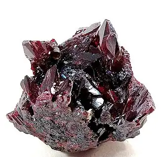 | Color | Rojo rubí, escarlata o bermellón; a la luz reflejada es gris azulado | |