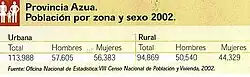 De acuerdo con los resultados del IX Censo Nacional de Población y Vivienda, realizado del 1 al 7 de diciembre de 2010 por la Oficina Nacional de Estadística (ONE), la población de Azua alcanzó los 214,311 habitantes. Como se muestra en el cuadro anterior, en Azua los hombres representan el 52% del total de la población, mientras que las mujeres suman el 48%. Este predominio masculino es más acentuado en las zonas rurales que en las urbanas, lo cual puede explicarse por la significativa emigración de mujeres trabajadoras hacia países europeos y hacia la capital del país.[17]