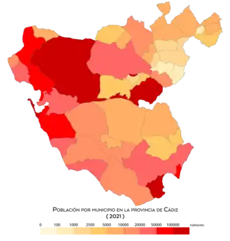La población de la provincia es de 1 258 730 habitantes (INE 2024),[3] de los cuales 638 807 viven en el área metropolitana de la Bahía de Cádiz-Jerez y 273 811 en el área metropolitana de la Bahía de Algeciras. Posee una superficie de 7435,85 km², siendo su densidad de población de 169,38 hab./km². La ciudad más poblada es Jerez de la Frontera con 212 730 habitantes (2022).