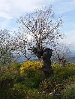 Tras la última glaciación, se implantó un clima más árido propiciando el desarrollo de vegetación xerófila y así, el hayedo retrocedió a las montañas Cantábricas.[30] Allí donde este se retiró, se implantó la encina, estando actualmente presente solo en rodales dispersos ya que la mayor parte desapareció al sustituirse por tierras de cultivo.[31] Son montes de pies raquíticos, utilizados tradicionalmente para carboneo y leña, de los cuales el más extenso es el encinar de Becares.[32] Junto a la encina se desarrollan el quejigo y las sabinas, que se encuentra en espacios más áridos y de más baja temperatura, como los sabinares de Crémenes y Mirantes de Luna.[33] En las zonas más húmedas se desarrolla el rebollo, ocupando grandes superficies (siendo la provincia leonesa la que mayor extensión presenta de ellos)[29] como monte degradado que ha perdido su porte original.