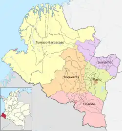 ![]() Ancuya • Cumbitara • Guaitarilla • Imués • La Llanada • Los Andes Sotomayor • Linares • Mallama • Ospina • Providencia • Ricaurte • Samaniego • Santacruz • Sapuyes • Túquerres |