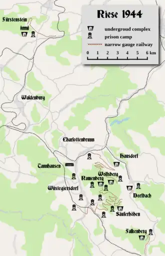 Insatisfecho con el progreso del proyecto, en abril de 1944 la supervisión de la construcción fue entregada a la Organización Todt. Los prisioneros del campo de concentración cercano fueron asignados a trabajos forzados. Ellos fueron desplegados en los trece campos y un nombre del hospital Gross-Rosen Museum en Rogoznica en las cercanías de los complejos. La red de estos campos ha sido nombrada Arbeitslager Riese (Lista de los subcampos de Arbeitslager Riese) y formó parte de la administración de Arbeitslager Riese; su comandante de campo (SS-Hauptsturmführer Albert Lütkemeyer) se encontraba en Al Wüstegiersdorf. Desde diciembre de 1944 hasta enero de 1945, los prisioneros fueron custodiados por 853 Schutzstaffel o SS. Tropas Gross-Rosen Museum en Rogoznica