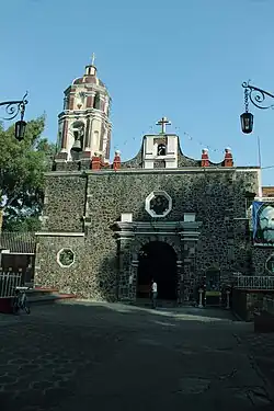 ![]() Perspectiva de San Andrés Apóstol, perteneciente a la fachada de la Iglesia de San Andrés Tetepilco, punto de referencia de la colonia del mismo nombre, al oriente de Ciudad de México. | ||