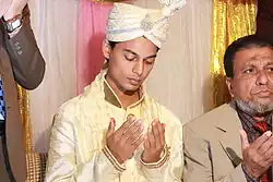 Un matrimonio entre los bengalíes a menudo consta de múltiples eventos en lugar de una sola boda. Podría decirse que los matrimonios concertados son la forma más común de matrimonio entre los bengalíes y se consideran tradicionales en la sociedad.[63] El matrimonio es visto como una unión entre dos familias en lugar de sólo dos personas, y juegan un papel importante en el desarrollo y mantenimiento de los lazos sociales entre clanes y aldeas.[64][65] Las dos familias son facilitadas por el ghotok (casamentero mutuo), y el primer evento se conoce como Paka Dekha o Dekhadekhi, donde todos los involucrados se familiarizan entre sí durante una comida en la casa de la novia. El primer evento principal es el Paan-Chini o Chini-Paan, organizado por la familia de la novia. Se reciben obsequios de la familia del novio y en este evento se fija la fecha de matrimonio.[66] Se lleva a cabo un adda (conversación profunda) entre las familias mientras consumen un banquete tradicional bengalí de comida, paan, té y mishti. El próximo evento es la velada mehndi, también conocida como gaye holud (cúrcuma en el cuerpo). A esto normalmente le sigue el evento principal, el walima, que recibe a miles de invitados. Se lleva a cabo un voto (aqd), donde se firma un contrato de matrimonio (Kabin nama). Un cadí o imán suele estar presente aquí y también recita el Corán y hace dua para la pareja. El novio debe pagar mahr (dote) a la novia. La Phira Yatra o Phira Khawa consiste en el regreso de la novia con su marido a su casa (que a partir de entonces se denomina naiyor) y se sirve payesh y leche. Otras ceremonias posteriores al matrimonio incluyen Bou Bhat, que tiene lugar en la casa del novio.