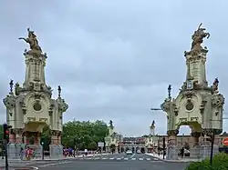 En el puente destacan los cuatro obeliscos monumentales, ubicados en sus extremos, copia de los del puente Alejandro III, de París, con 18 metros de altura, coronados por grupos escultóricos. Las figuras ecuestres que coronan los obeliscos fueron realizadas por el escultor madrileño Ángel García Díaz.[2]