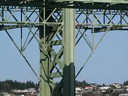 A diferencia de Gertie, cuyas secciones de cubierta premontadas se colocaron primero en su lugar en el centro del tramo principal y en los extremos de las partes laterales, en el nuevo puente, los tramos de la viga de celosía se fueron instalando primero desde cada torre, avanzando desde allí. Cuatro equipos de trabajo, uno en cada vano lateral y dos en el vano principal (uno en cada lado) trabajaron simultáneamente, completando un promedio de 40 m de cubierta al día. Las cuadrillas de los equipos laterales trabajaban hacia la costa y las cuadrillas del vano principal hacia la otra torre. En mayo de 1949, el trabajo estaba a punto de completarse. El 28 de mayo, los operarios instalaron el acuerdo superior de cierre en el vano principal, y durante los dos días siguientes terminaron de cerrarlo. El 1 de junio, el tablero de celosía de perfiles de acero la cubierta de la carretera se declaró completado.