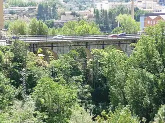 Consta de cinco arcos de medio punto de 11,15 metros y dispone de una altura considerable de 28,60 metros. Es un puente construido en piedra, con un dibujo cuidado al detalle, cuidadosamente trabajado. Fue ampliado con una losa volada de hormigón armado.
