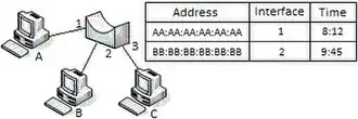 El término de autoaprendizaje se utiliza también para dispositivos con más de dos puertos. Como ejemplo, considerando tres equipos (A, B y C) conectados a los puertos (1, 2 y 3, respectivamente) de un bridge; inicialmente la tabla está vacía y ocurre lo siguiente: el equipo “A” envía una trama al “B”, esta trama llega al bridge por el interface 1, a continuación el bridge examina la dirección de origen y al no existir ninguna entrada, la crea para “A”, consignando la dirección física MAC de “A”, el número de interface 1 y el tiempo. A continuación comprueba la dirección de destino y la busca en la tabla. Como no existe se envía dicha trama por los puertos 2 y 3. Una vez la trama sea recibida por “B”, este responde a dicha trama y esta respuesta llega al puente a través del interface 2; entonces se crea una nueva entrada para “B” en la tabla, consignando la dirección física MAC de “B”, el número de interface 2 y el tiempo. “C” también recibe el envío, pero al no ser el destinatario, simplemente desecha el paquete. A partir de este momento es posible enviar paquetes entre “A” y “B” utilizando sólo el ancho de banda necesario, (sin inundar los segmentos de red a través de todos los puertos de las interfaces del bridge, menos el puerto por el que llega la trama). En el caso de “C” se repetirá el mismo proceso anterior cuando sea conveniente, quedando guardada la información en la tabla de idéntica manera a lo expuesto.