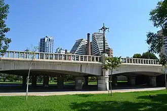 El puente tiene una longitud de 220 metros, el más largo de la ciudad. Sus dos entradas están adornadas por cuatro esculturas monumentales en bronce, conjunto escultórico denominando los guardias del Puente. Fue inaugurado el diciembre del 1999 por la alcaldesa Rita Barberá.