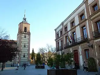 La plaza de Carabanchel; a la derecha, el edificio de la Junta Municipal del Distrito de Carabanchel; al fondo, la iglesia de San Sebastián Mártir | ||