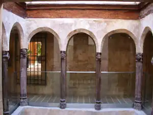 - Patio gótico del XV, que ahora sirve como galería de arte. Tiene columnitas de sección alveolada y capiteles con dos motivos heráldicos diferentes, una flor de lis y una puerta flanqueada por dos torres. La disposición de espacios y los elementos decorativos expresan un carácter austero que es propio de una casa aragonesa de aquella época.