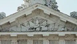 Decorada con ornamentos militares y de caza en bajorrelieves localizados en los contrafuertes, sobre el frontón se alza entre banderas el escudo real, flanqueado por dos esfinges recostadas, obras llevadas a cabo por Juan Domingo Olivieri, como los hermosos jarrones de los que brota un penacho en llamas que coronan las pilastras del monumento.