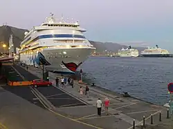 ![]() Panorámica de los muelles del puerto con dos trasatlánticos atracados. Al fondo el Auditorio de Tenerife, icono de la ciudad. | ||