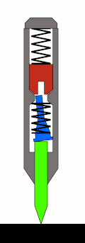 La masa del martillo está cargada por resorte desde la parte posterior del punzón mediante un gran primavera. (La compresión de precarga del muelle generalmente se puede ajustar aflojando o apretando la tapa del extremo de la parte posterior del punzón, para disminuir o aumentar la fuerza del punzón.) Un orificio detenido perforado en la parte central delantera de la masa del martillo frente al tambor actúa como un receptor para la varilla, y como un yunque para la acción del golpe.