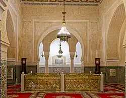 En el lado sur de la cámara del patio hay un gran arco con puertas de madera ornamentadas que conduce a una antecámara rectangular que precede a la cámara del mausoleo propiamente dicho. El mausoleo es una cámara cuadrada que alberga las lápidas (mqabriya) de Mulay Ismaíl (fallecido en 1727), su hijo y sucesor Ahmed ben Ismaíl (fallecido en 1729) y el posterior sultán Abd ar-Rahmán ibn Hisham (fallecido en 1859). En el lado sur del mausoleo hay otra gran sala de lectura dividida por una arcada de triple arco y que contiene armarios para libros. Cada una de estas cámaras está cubierta con decoración de estuco tallado y alberga también varias candelabros de bronce.[9][38] Las lápidas reales son de mármol y están ricamente talladas con inscripciones caligrafícas árabes y motivos de arabescos en un estilo similar al de las lápidas de mármol de las tumbas saadíes.[24] La cámara sepulcral también alberga dos relojes de pie que fueron obsequios del rey Luis XIV de Francia.[2] El mausoleo sigue siendo visitado hoy en día por los marroquíes que buscan la baraka en la tumba de Mulay Ismaíl, además de ser una importante atracción turística de la ciudad.[2][4][39]