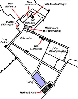 El primer elemento que se construyó fue el Dar al-Kebira, el palacio privado del sultán y su familia, situado en el emplazamiento de la anterior Qasba de la ciudad. Se terminó en 1679.[19][22]: 266 La mezquita principal de la Qasba, hoy conocida como mezquita de Lalla Aouda, también fue renovada o reconstruida, posiblemente hacia 1677.[7][7][17] Mulay Ismaíl eligió la cercana tumba de un santo local, Sidi Abd ar-Rahman al-Majdoub, como emplazamiento de un nuevo mausoleo que fundó para sí mismo.[9][17] A lo largo de su reinado se fueron añadiendo o ampliando nuevas estructuras a la Qasba. Una de las últimas construcciones antes de su muerte, llevada a cabo entre 1721 y 1725, fue el Heri al-Mansur, un palacio en el extremo sur de la Qasba (que aún se conserva en parte) que incluía vastos establos.[17] La puerta monumental conocida como Bab Mansur al-Alj (o Bab Mansour), que aún se conserva con vistas a la plaza al-Hedim, no fue terminada hasta 1732 por su hijo Mulay Abdallah.[22] Su otro hijo y breve sucesor, Ahmed ben Ismaíl, llevó a cabo modificaciones en el mausoleo de Ismail durante sus dos breves reinados (en 1727-28 y 1728-29) y él mismo fue enterrado aquí en 1729..[9]