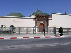 El Mausoleo de Mulay Ismaíl es un complejo funerario situado en el lado suroeste del antiguo palacio Dar al-Kebira, en un espacio que antiguamente se encontraba entre los muros perimetrales interior y exterior del palacio.[9] Eligió este lugar en parte porque ya se consideraba santificado por la presencia de la tumba de Abd al-Rahman al-Majdoub, poeta y místico sufí del siglo XVI.[9][38] El complejo se construyó bajo su reinado, pero se modificó y amplió en múltiples ocasiones, sobre todo bajo su hijo y breve sucesor, Abou al-Abbas Ahmed ben Ismaíl (que gobernó, con interrupciones, entre 1727 y 1729), quien a su vez fue enterrado aquí posteriormente.[9][24]: 270 Al complejo funerario se entraba originalmente por el norte, directamente desde el palacio Dar al-Kebira. La entrada actual por el sur data del periodo del protectorado francés en el siglo XX. El complejo original era menos extenso que el actual y es probable que su planta solo incluyera la cámara sepulcral, las salas contiguas a ambos lados y el patio principal de acceso. Por tanto, es probable que los demás patios y pasadizos se añadieran posteriormente.[9] Otros recintos y patios adyacentes al complejo están ocupados por cementerios conocidos como Jama' Rkham.[24]: 271