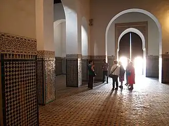 El patio central principal del complejo funerario está escasamente decorado, salvo por una fuente central y el pavimento "zellige". Los lados occidental y oriental del patio están ocupados por pórticos de tres arcos de herradura. El muro oriental del patio, frente al mausoleo, también presenta un pequeño mihrab (nicho que indica la dirección de la oración). Detrás están la cámara del mausoleo y las salas contiguas. La más septentrional de estas salas, a la que se accede directamente desde la esquina noreste del patio, consiste en un patio interior cubierto por una alta cúpula. La disposición de este patio es similar a la de la Cámara de las Doce Columnas de las Tumbas saadíes, consistente en un cuadrado delineado por doce columnas de mármol dispuestas en grupos de tres en cada esquina, alrededor del cual discurre un espacio de galería.[9] En el muro oriental hay otro mihrab y en el occidental, una pequeña cámara lateral. Los muros superiores y las zonas que rodean el mihrab y las puertas están decorados con estuco tallado y pintado con motivos arabescos y epigráficos típicos de la arquitectura marroquí. En el centro del patio hay una fuente ornamentada, mientras que el techo de la cúpula superior presenta principalmente madera pintada y tallada. Las columnas de mármol presentan capiteles marroquíes-andalusíes tallados con motivos de hojas, palmas y palmetas.[38][9] Se cree que estas columnas de mármol, así como los paneles de mármol ornamentalmente tallados del arco que conduce a la antecámara del mausoleo, son espolios tomados por Mulay Ismaíl de los antiguos palacios saadíes de la Qasba de Marrakech (como el Palacio El Badi).[24]: 270