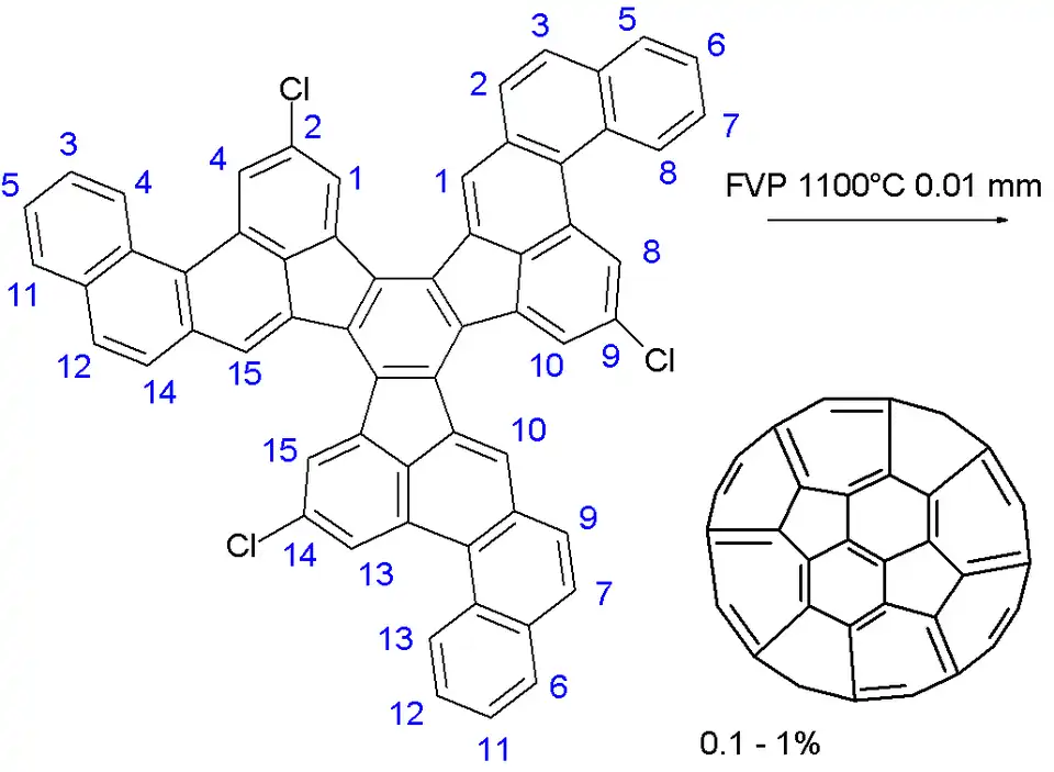 En el paso final, un hidrocarburo policíclico aromático que consiste en 13 hexágonos y 3 pentágonos fue colocado en pirólisis rápida al vacío a 1100 °C y 0.01 Torr. Los tres enlaces carbono-cloro funcionaron como precursores de radicales libres y la esfera fue formada en una serie de reacciones de radicales. El rendimiento químico fue bajo (0.1 a 1%). Un pequeño porcentaje de fullerenos se forma en cualquier proceso que involucre la quema de hidrocarburos, como en la llama de una vela. El porcentaje de rendimiento obtenido a través de la combustión es un poco mayor al 1%. El método propuesto anteriormente no provee ninguna ventaja para la síntesis de fullerenos en comparación con el método usual de combustión y por lo tanto, la síntesis orgánica de fullerenos permanece como un reto para la química.
