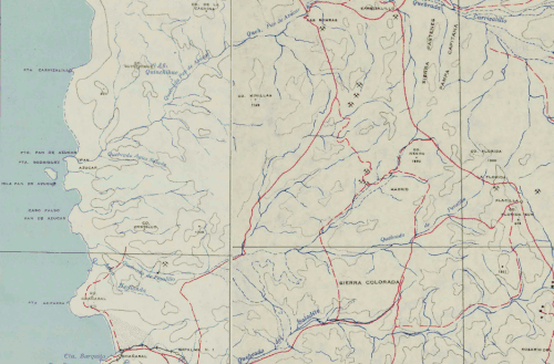 - Peralillo (Quebrada de). 26° 14' 70° 28' Nace en los alrededores del cerro Negro i lleva agua tan mala que los animales rehusan bebería, la que corre en hilítos sobre la roca desnuda i deja una capa de sales en las estrechuras; ofrece vegas, que se suceden, con pequeñas interrupciones, en una estensión de 6 a 8 kilómetros, se angosta mucho en los últimos 3 km de su curso i termina con un salto vertical al llegar a la playa del mar. Presenta un sendero de leñadores al lado Ñ, a medio km al E de su desembocadura, que. baja a la playa haciendo zig-zigs en una falda parada i pedregosa; comprende 63 250 hectáreas de hoya hidrográfica. 98, n, p. 386 i 496 i carta de San Román (1892); 99, p. 14; 128; 156; i 161, i, p. 14 i 27.