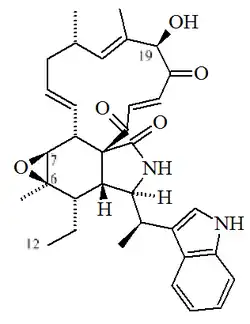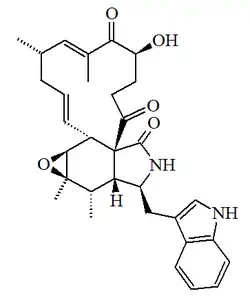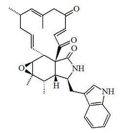 C32H38N2O5 | 149560-98-5 | 530.663 | Sólido PF = 146 °C | Aislado de los hongos Chaetomium globosum y Chaetomium subaffine.[26] | [α]D = -82.8 (MeOH); UV: [neutral]λmax212 (log ε4.71) ;221 (log ε4.8) ;266 (log ε3.93) ;272 (log ε3.92) ;291 (log ε3.82)(MeOH) |