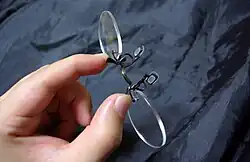 - Esta obra contiene una traducción parcial derivada de «Pince-nez» de Wikipedia en inglés, concretamente de esta versión del 18 de febrero de 2024, publicada por sus editores bajo la Licencia de documentación libre de GNU y la Licencia Creative Commons Atribución-CompartirIgual 4.0 Internacional.