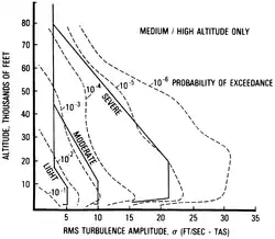 Se parametrizan mediante la probabilidad de superación o la gravedad de la turbulencia. En las especificaciones militares se proporciona un gráfico de la intensidad de la turbulencia en función de la altitud, en el que se muestran líneas de probabilidad de superación constante y rangos correspondientes a diferentes gravedades de turbulencia.[17]