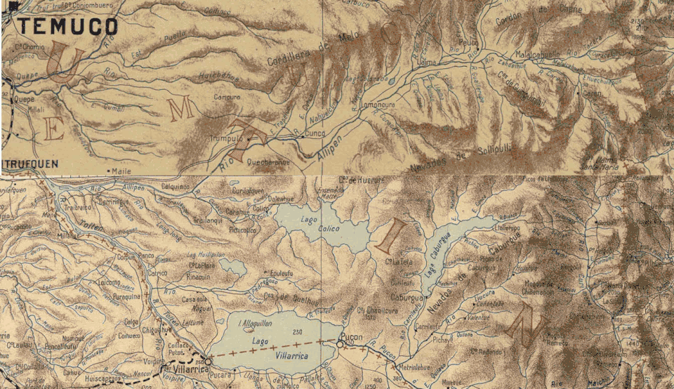 - Aillipén.-—Río del departamento de Temuco. Procede de la vertiente ó faldas del volcán Quetrodugun; corre mas ó menos al O. por pendientes de áspera serranía selvosa en su parte superior y más abajo por campos medianamente llanos y despejados, y va á echarse en la margen boreal del Toltén, junio á Pítrufquén y á poca distancia al SE. del fuerte de Freire. Es el mayor tributario de la derecha de ese río, y su curso podrá alcanzar á unos 40 kilómetros. Hacia su cabecera contiene manantiales de aguas calientes y cerca de su término un pequeño caserío de su mismo nombre. Éste es inmutación de Alipén, denominación que algunos le han dado, proveniente de alimn con la interpuesta partícula pe, significando que tiene calor ó quema.