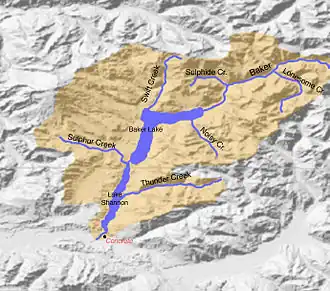 La mayor parte del lago Baker se encuentra dentro del bosque nacional Mount Baker-Snoqualmie. La presa superior está en el condado de Whatcom y la presa Baker Inferior está en el condado de Skagit, que está situado al norte de Concrete. Ambas represas son propiedad de Puget Sound Energy.[1]