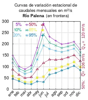 | Curva de variación estacional (según probabilidad de excedencia) del río Palena en la frontera, tras su entrada a Chile. | |