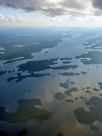 Vista aérea del lago Minnitaki, que es atravesado por el río English en su curso medio | ||