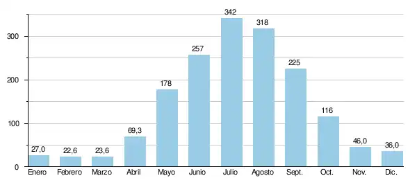 En el periodo de observación de 61 años, el caudal mensual mínimo ha sido de 12,2 m³/s en febrero de 1982, mientras que el caudal mensual máximo fue de 810 m³/s en julio de 1942.
