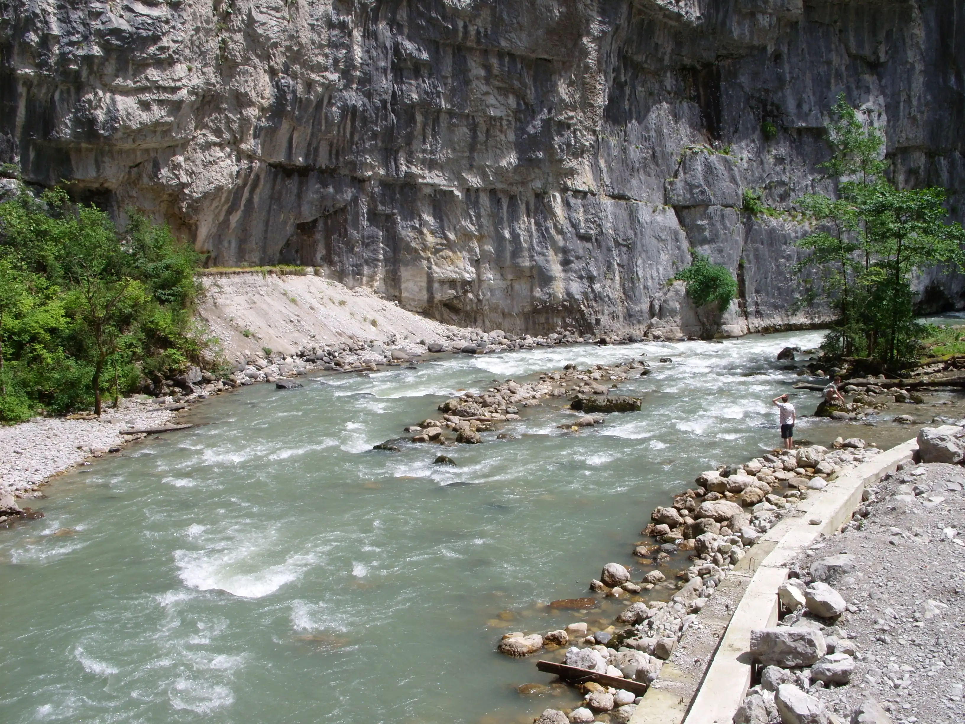 Sobre el río se construyeron 11 puentes. En su curso central se encuentran fuertes rápidos, llegando a tener un desnivel de 50.9 m/km. El último tramo de 7 kilómetros hasta la confluencia con el río Gega discurre más tranquilamente, con un desnivel de 22.9 m/km.[1]