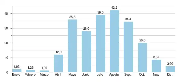 El caudal medio mensual observado en marzo (mínimo de estiaje) es de 1.07 m³/s, apenas un 2.5 % del caudal medio del ems de agosto (42.2 m³/s), lo que subraya la ampitud muy elevada de las variaciones estacionales. En los 45 años del periodo de observación, el caudal mensual mínimo ha sido 0.00 m³/s, es decir que el río no llevaba agua en marzo de 1997, mientras que el caudal máximo se elevó a 155 m³/s en agosto de 1990.