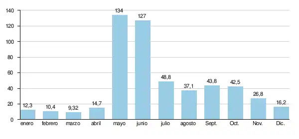 Y estas diferencias pueden ser más importantes aún según los años: así durante el período de observación de 65 años, el caudal mínimo mensual fue de 3,81 m³/segundo, en marzo de 1930, mientras que el máximo mensual de caudal ascendió a 281 m³/segundo en mayo de 1984.
