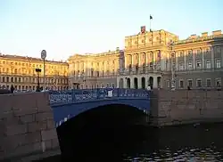 En 1736, se construyó el paseo a lo largo de la orilla del Moika que era de madera. Originalmente el río era atravesado por cuatro puentes: el Azul, el Verde, el Amarillo, y el Rojo. El puente Azul con sus 97,3 m de ancho, en la actualidad apenas visible debajo de La Plaza de San Isaac, sigue siendo el puente más ancho de toda la ciudad.