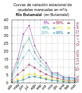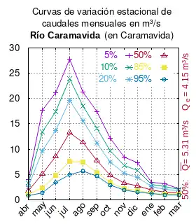 El caudal del río (en un lugar fijo) varía en el tiempo, por lo que existen varias formas de representarlo. Una de ellas son las curvas de variación estacional que, tras largos periodos de mediciones, predicen estadísticamente el caudal mínimo que lleva el río con una probabilidad dada, llamada probabilidad de excedencia. La curva de color rojo ocre (con ) muestra los caudales mensuales con probabilidad de excedencia de un 50%. Esto quiere decir que ese mes se han medido igual cantidad de caudales mayores que caudales menores a esa cantidad. Eso es la mediana (estadística), que se denota Qe, de la serie de caudales de ese mes. La media (estadística) es el promedio matemático de los caudales de ese mes y se denota .
