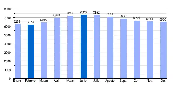 | Caudal medio mensual del San Lorenzo en la estación hidrológica de Ogdensburg, Nueva York (en m³/s y calculado en el período 1860-1972)[7] |