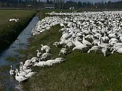 Miles de gansos de nieve invernan en el estuario del río Skagit. Estos gansos se alimentan de plantas de los pantanos intermareales, como el junco, y se sienten atraídos por las tierras de cultivo cercanas donde encuentran restos de patatas en los campos. También los cisnes trompeteros se sienten atraídos por el hábitat del estuario. Puede haber varios cientos de cisnes en el valle de Skagit, de octubre a febrero.