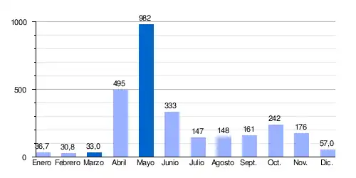 | Caudal medio mensual del Vaga en la estación hidrométrica de Shenkursk (Datos calculados en 1944-75, 29 años, en m³/s) |