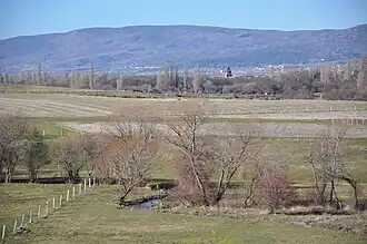 Río de la Hija a su paso por el Soto, con la Iglesia de Blacha al fondo | ||