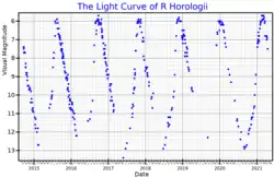 - ↑ a b c R Horologii Archivado el 4 de marzo de 2016 en Wayback Machine. (The Bright Star Catalogue)