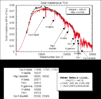 La radiación en el Sol es de 63 450 720 W/m². La energía que llega al exterior de la atmósfera terrestre sobre una superficie perpendicular a los rayos solares lo hace en una cantidad fija, llamada constante solar (1353 W/m² según la NASA) variable durante el año un ± 3 % a causa de la elipticidad de la órbita terrestre.[2] Esta energía es una mezcla de radiaciones de longitudes de onda entre 200 nm y 4000 nm, que se distingue entre radiación ultravioleta, luz visible y radiación infrarroja.