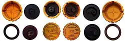 Tapas de radiador para sistemas de refrigeración automotrices presurizados. De las dos válvulas, una evita la formación de vacío, la otra limita la presión