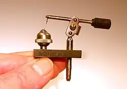 también llamado Detector de cristal a galena. La pieza de galena es el objeto plateado irregular (segunda posición desde la izquierda de la fila superior), y el bigote de gato es el fino alambre retorcido que sirve para ajustar sobre la galena el punto de cierre del circuito detector.