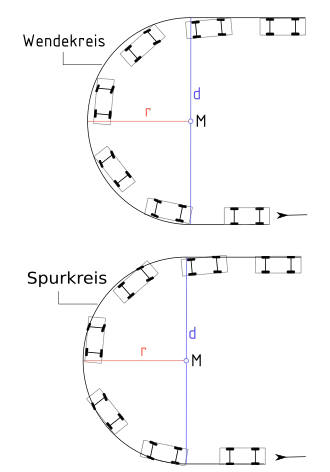 Existen dos tipos de radios de giro, uno denominado radio de giro de ruedas, que describirá el radio formado por el recorrido de los neumáticos del vehículo, y el radio de giro pared, pared a pared, o entre paredes, que hará lo propio en función del ancho total del vehículo. La distinción entre estas dos mediciones se hace necesaria al diferenciar el giro de un vehículo en calle, donde posiblemente el radio de giro de ruedas sea suficiente para determinar la maniobrabilidad del vehículo con respecto a los cordones de las veredas, mientras que en interiores esta medición podría resultar ineficaz, debiéndose considerar el ancho total del vehículo antes de que alcance las paredes.
