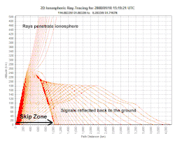 Debido a la estructura multicapa de la ionosfera, a menudo la propagación se produce simultáneamente por caminos diferentes, dispersos por la capa "E" o "F" y con distinto número de saltos, fenómeno que puede resultar molesto para determinadas técnicas. Sobre todo para las frecuencias más bajas de la banda de onda corta, la absorción de energía de radiofrecuencia en la capa ionosférica más baja, la capa "D", puede imponer un grave límite. Esto se debe a las colisiones de electrones con moléculas neutras, que absorben parte de la energía de una radiofrecuencia y la convierten en calor.[16] Las predicciones sobre la propagación de las ondas ionosféricas dependen de: