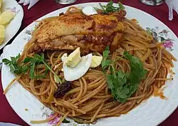 Los platos típicos de esta localidad son: los camarones (en variados estilos) servidos en torrejas, sopa seca, arroz con pato, chicharrones, adobo de cerdo, carapulcra, cuyes y conejos guisados en olla de barro.