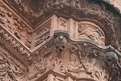 El portal de la Universidad se divide en tres cuerpos horizontales.[2] En orden ascendente el inferior está dedicado a los Reyes Católicos (representados en un medallón central), el segundo al emperador Carlos V y el tercero al Paraíso. En la gran pilastra de la derecha (mirando a la fachada), y en la terminación del primer cuerpo, se encuentran a modo de capitel labradas tres calaveras. Siendo la de la izquierda la que porta encima una rana de pequeño tamaño.[7]