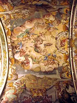 La nave y el crucero llevan un apilastrado con capiteles de orden corintio apeados en rocallas. Las pilastras de la nave flanquean capillas hornacina donde se situaban retablos hoy perdidos. Sobre los capiteles, en el friso y de manera similar a lo que encontramos en el crucero, se pintan parejas de querubines.